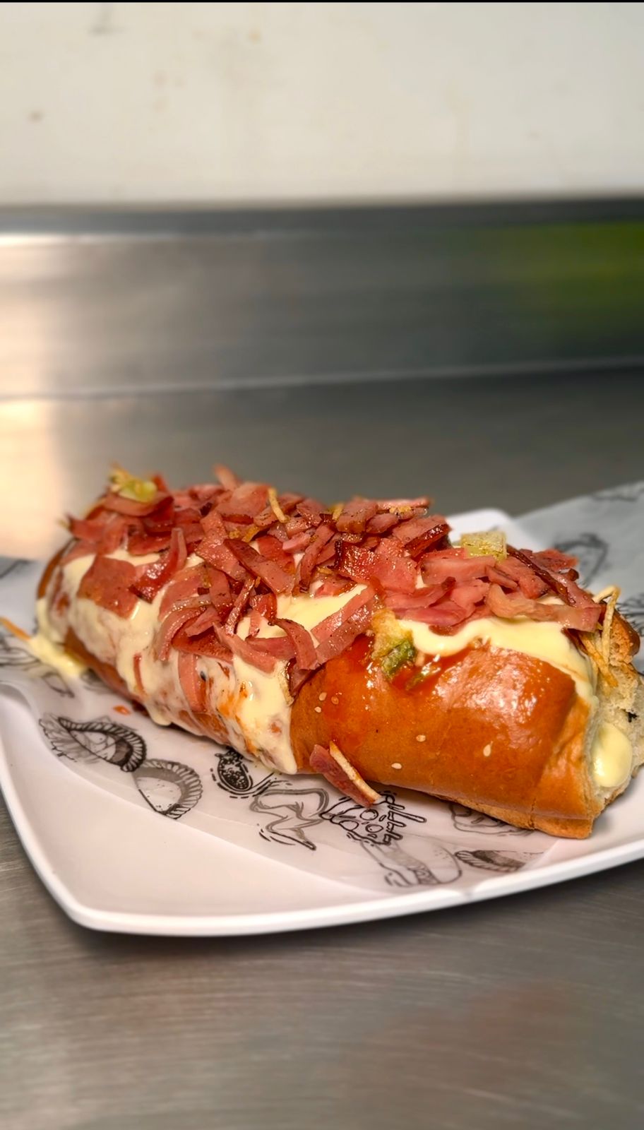 Delicioso Perro Especial con pan brioche, salchicha americana, tocineta, fusión de queso gratinado, cebolla, tomate picado y ripio de papas, salsa de la casa. Acompañada de una porción de papas personal a elección.