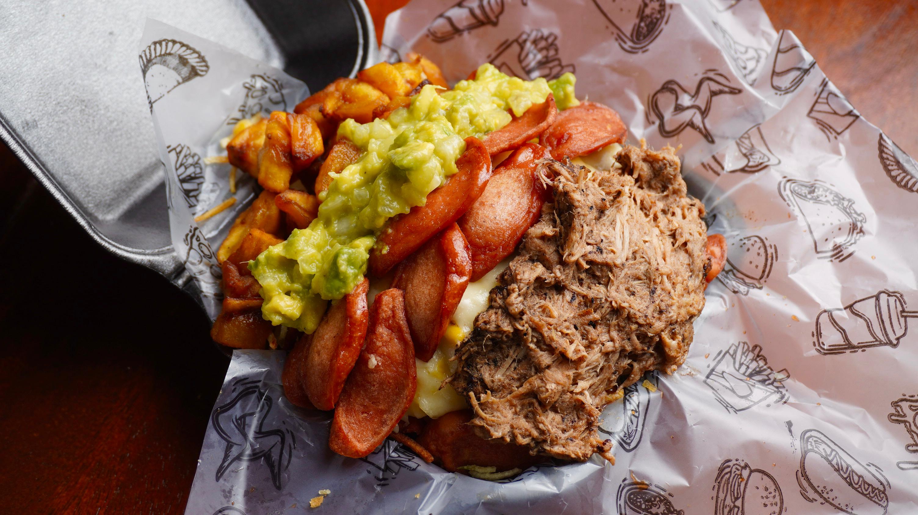 Papa criolla o francesa, salchicha, carne de res desmechada, madurito, maicitos, guacamole, costilla ahumada, ripio de papa, fusión de queso gratinado y salsa de la casa.