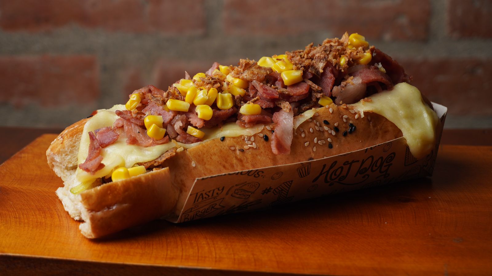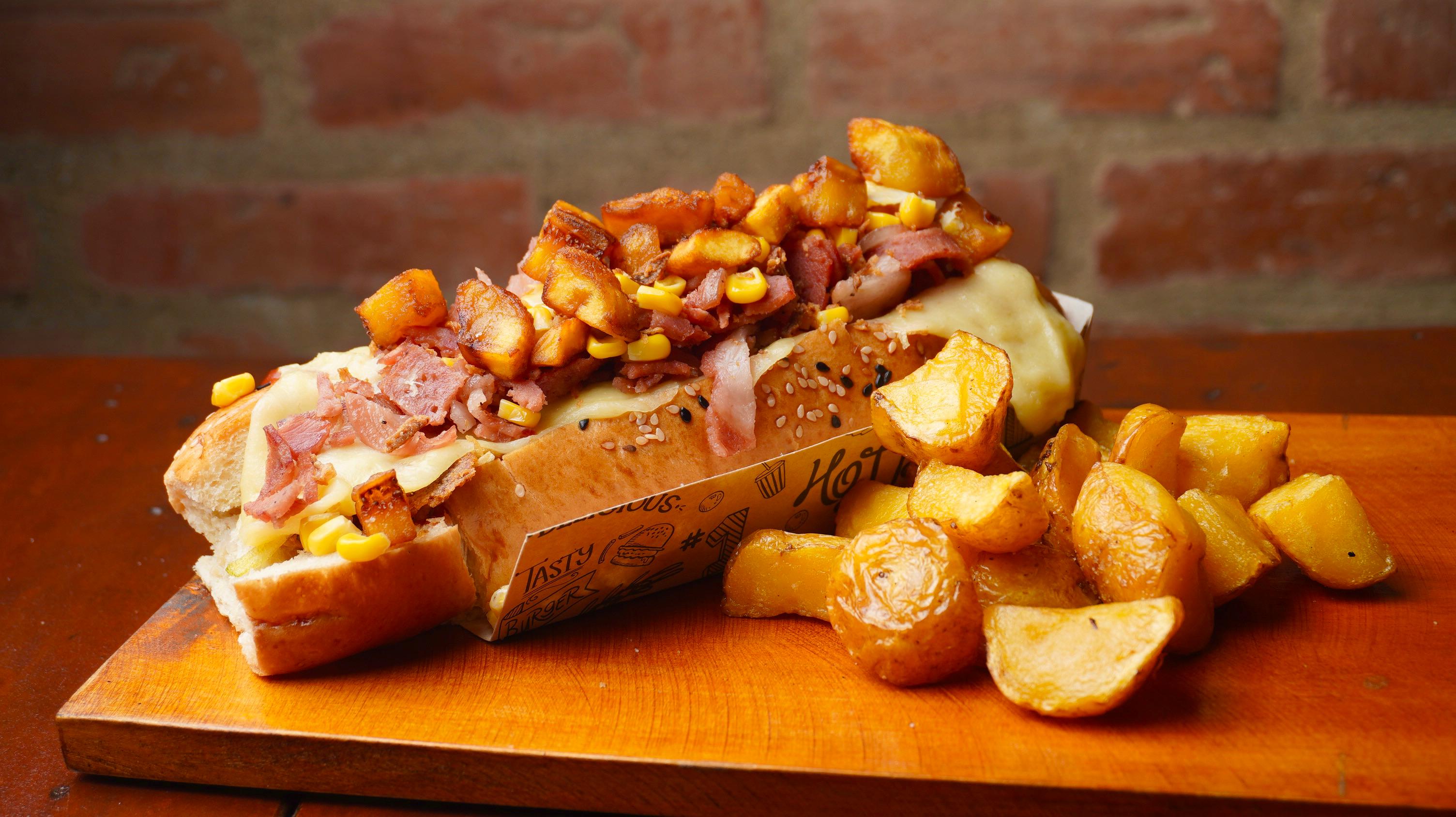 Delicioso Perro Ranchero Brutal con pan brioche, salchicha Ranchera, tocineta ahumada, tomate y cebolla picada, cebolla crispy, maicitos, fusión de queso gratinado y salsa de la casa. Acompañada de una porción de papas personal a elección.