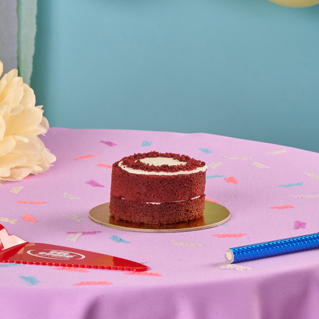 10 Porciones, dos capas de torta de chocolate con un intenso color rojo. Rellena y cubierta con una crema suave, con un sutil sabor a chocolate blanco y leche condensada. Decorado con migas de torta color rojo