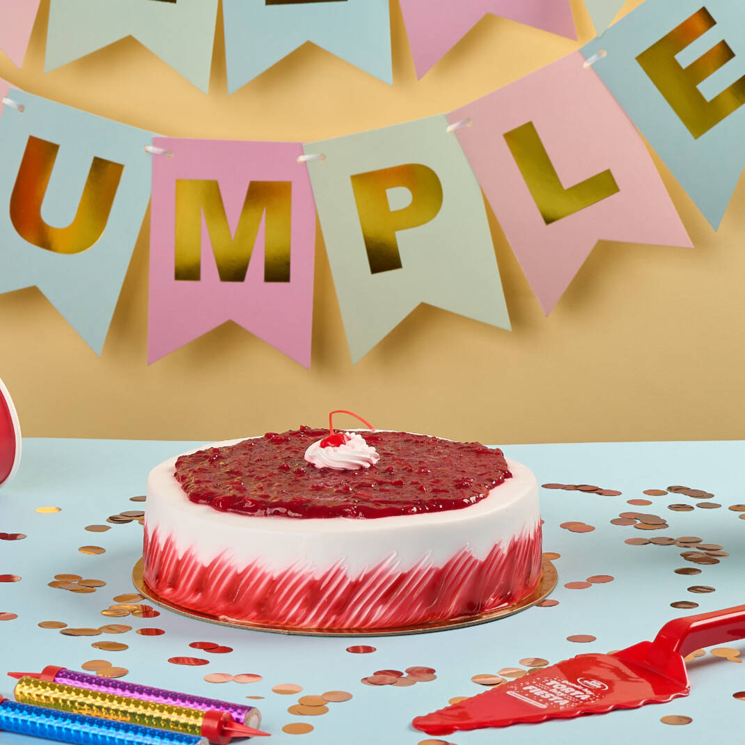 4 porciones, Dos capas de torta de vainilla levemente humedecidas para hacerlas más suave. En su interior encontrarás un delicioso relleno de mermelada y trozos de mora, fresa y cereza integrados. Decorado con una exquisita cobertura de crema de vainilla, con glaseado de frutos rojos, y el toque final se lo da una mermelada con trozos de mora, fresa y cereza en la parte superior