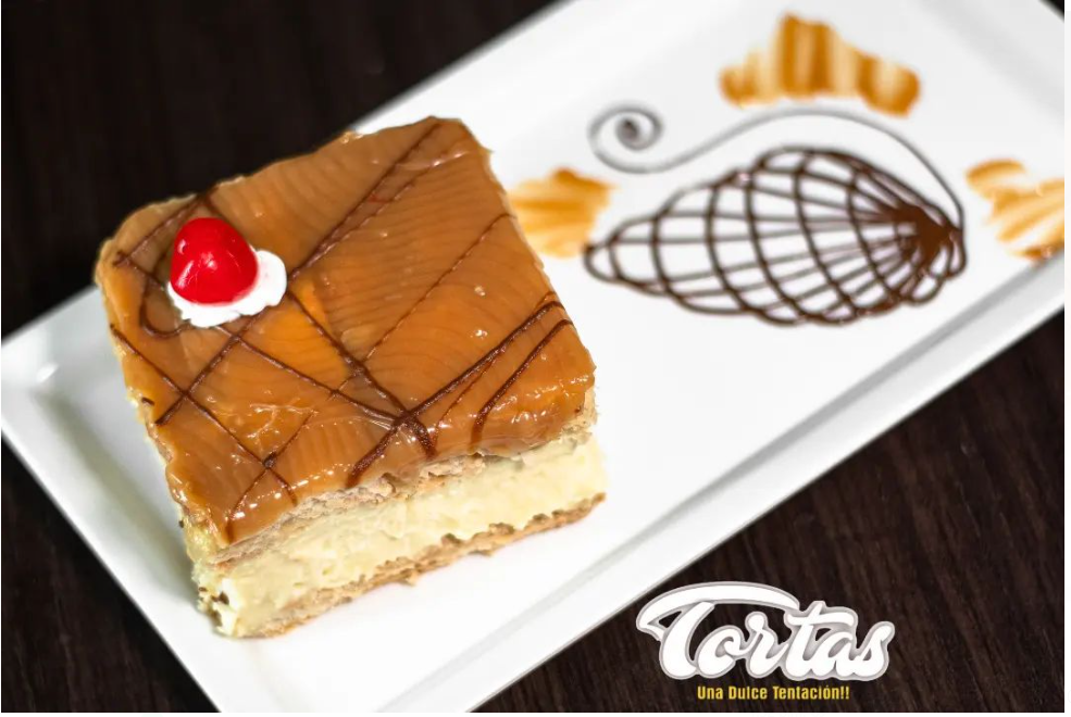 Pasta de hojaldre crujiente con relleno de crema pastelera, decorada en arequipe y figura en chocolate.