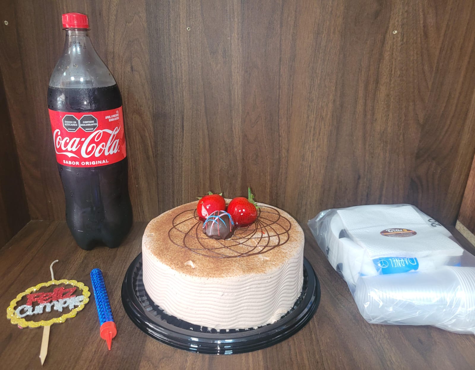 Combo Cumpleaños acompañado de Torta Genovesa de Chocolate ½ Lb, Coca Cola Original 1Litro Medio, Vela Volcan, Feliz Cumpleaños, 20 platos, 20 vasos y 20 cucharas y 40 servilletas.