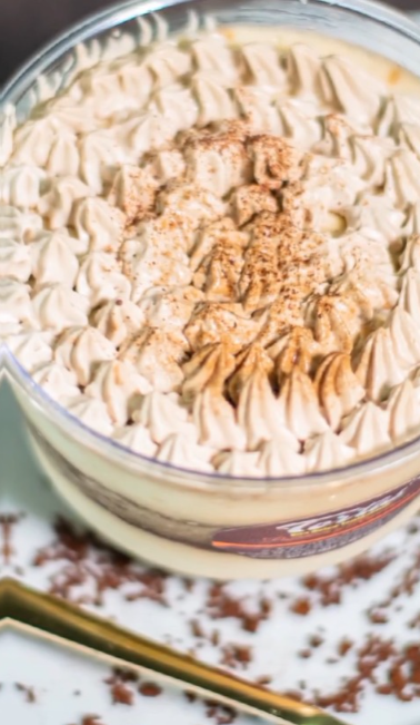 Postre súper cremoso a base de crema de leche, milo, galletas ducales, cereza y figura en chocolate.