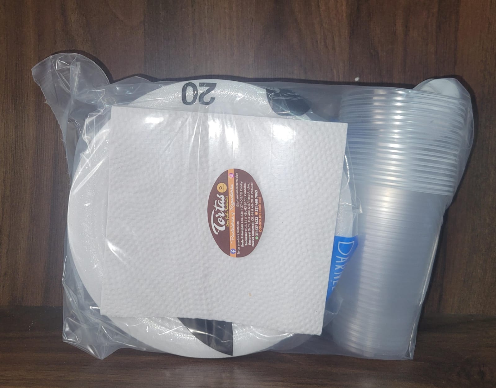 20 platos, 20 vasos y 20 cucharas y 40 servilletas