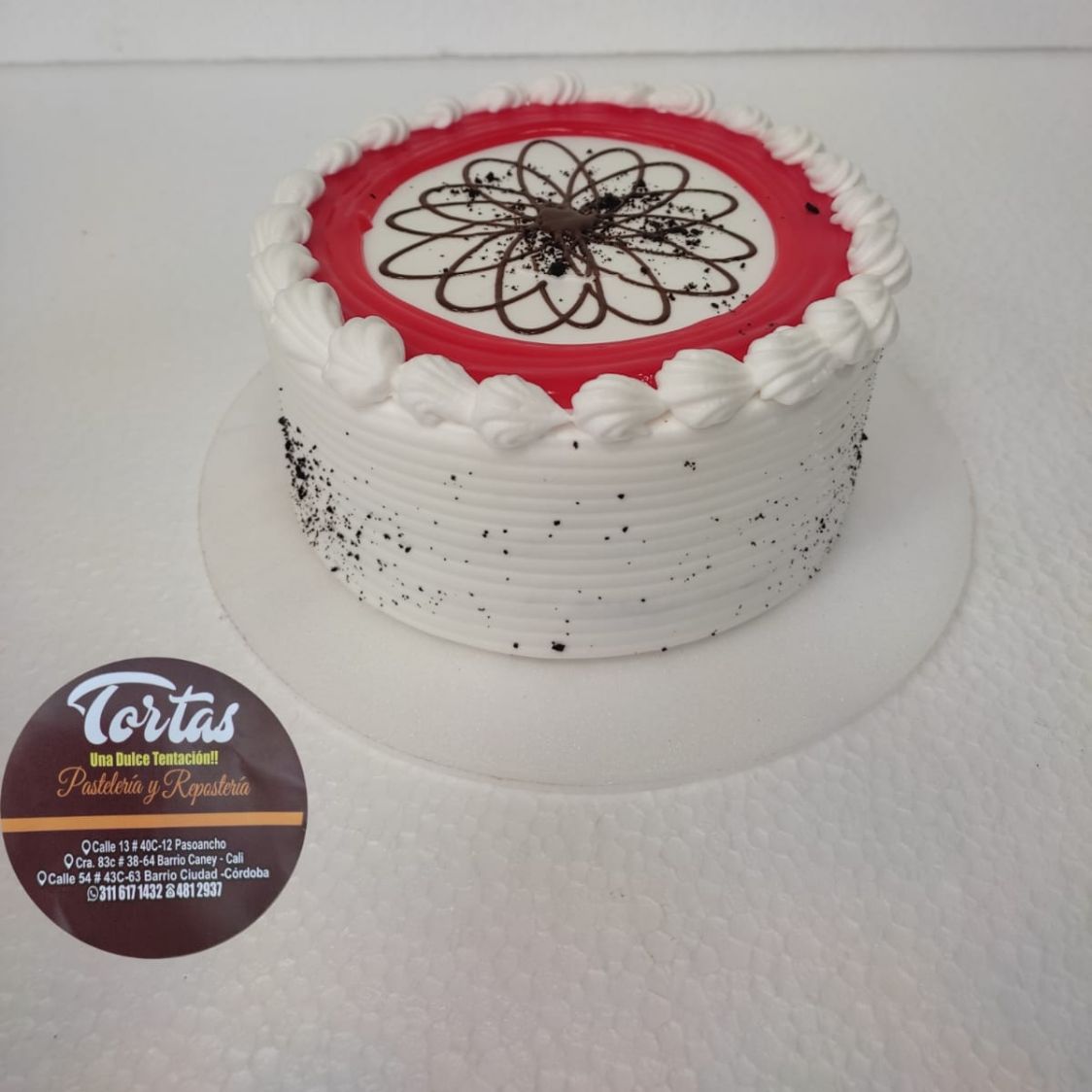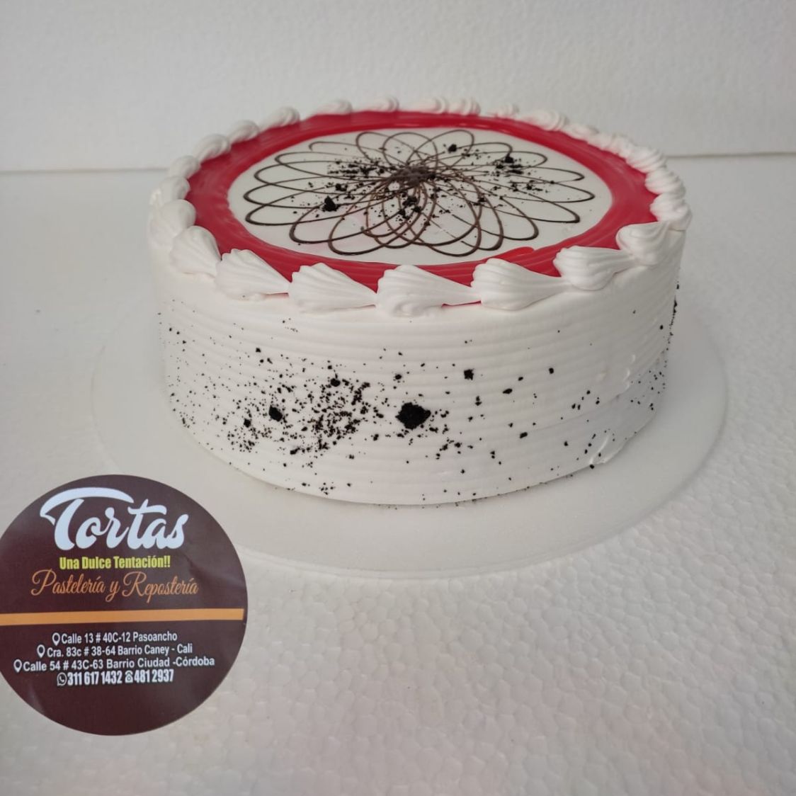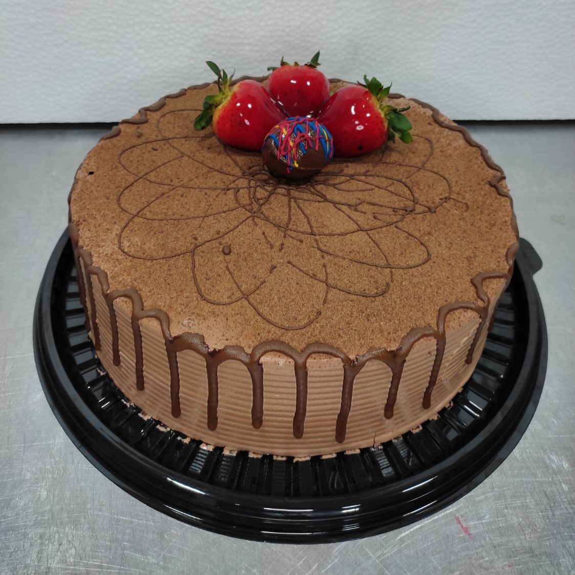 Bizcochuelo de chocolate humedecido en tres leches con relleno de mora y arequipe, cubierto crema chantilly de chocolate y decorada con chip blanco, chip de colores, chip negro y moritas: huevos, agua, premezcla a base de harina, sal, azúcar, esencia artificial de vainilla, cocoa, mantequilla.