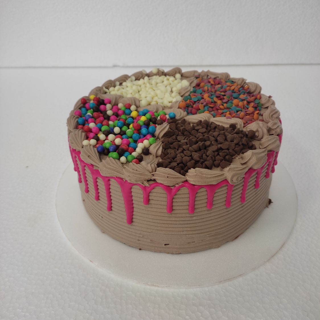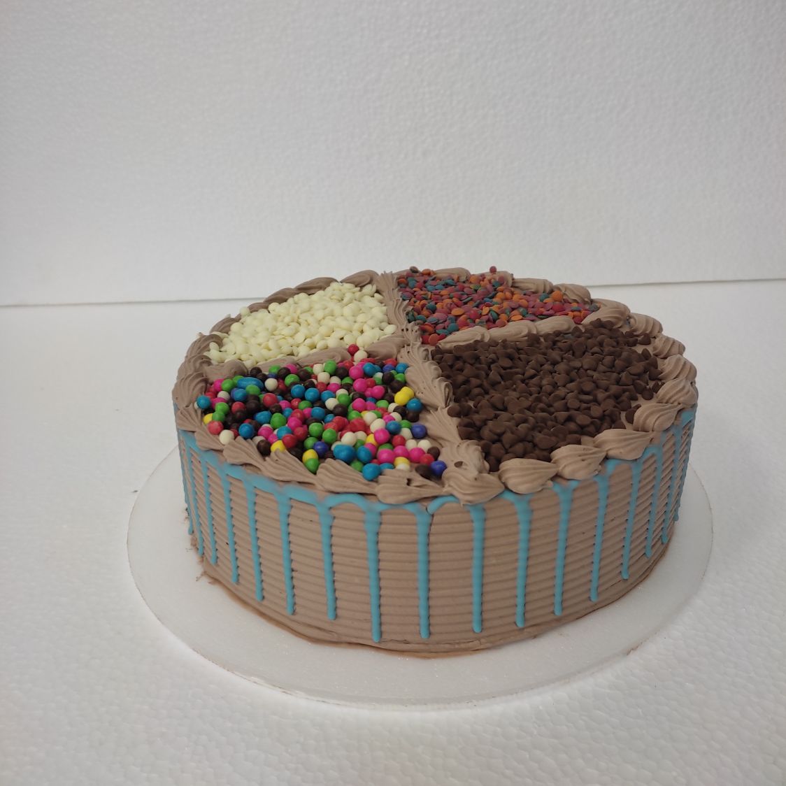 Torta fría de chocolate de mora y arequipe, cubierto crema chantilly de chocolate y decorada: chip blanco, chip de colores, chip negro y moritas: huevos, agua, premezcla a base de harina, sal, azúcar, esencia artificial de vainilla, cocoa, mantequilla.defria