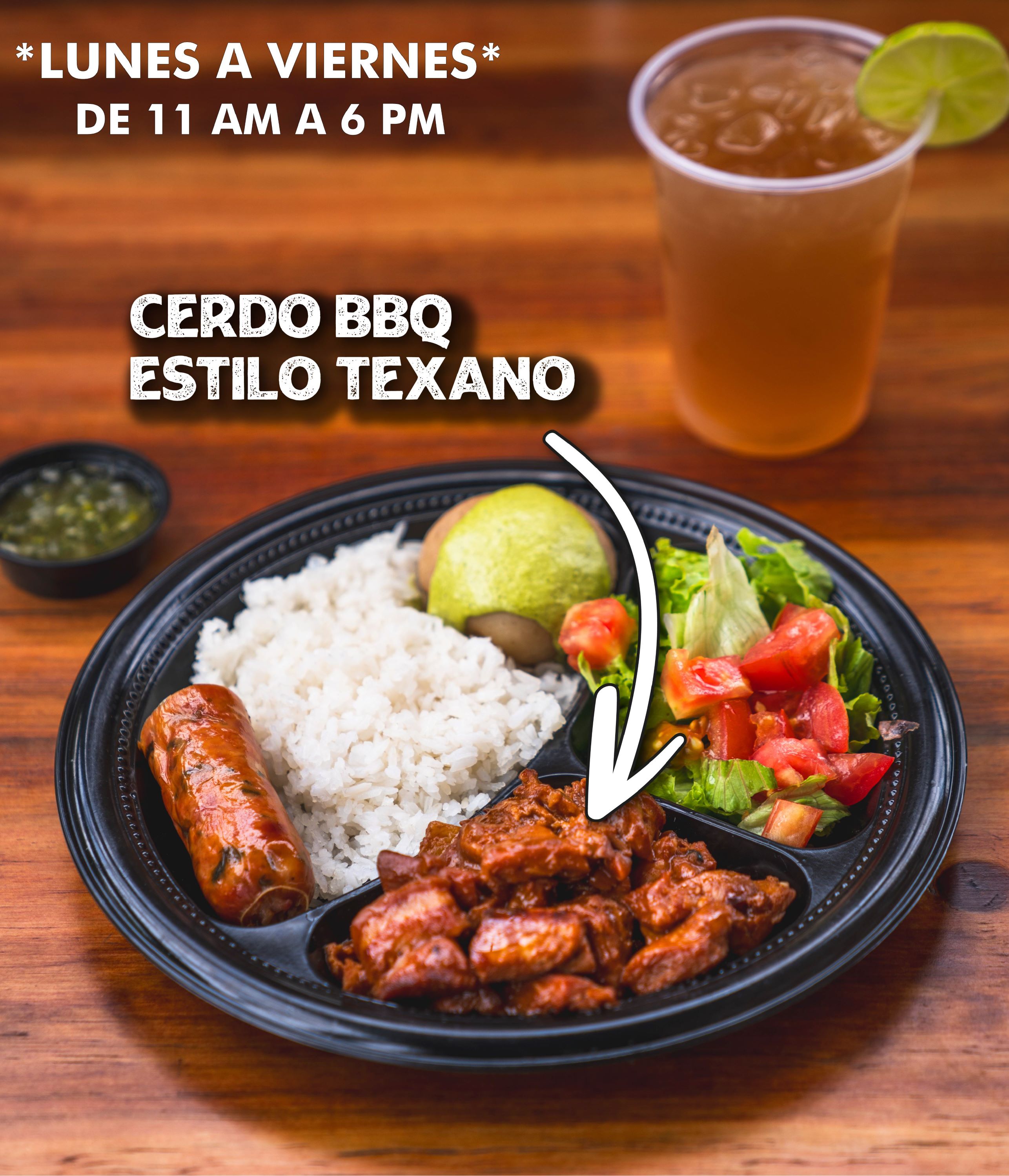 Cerdo bbq estilo texano + chorizo + arroz + papa cocida + ensalada + aguapanela.