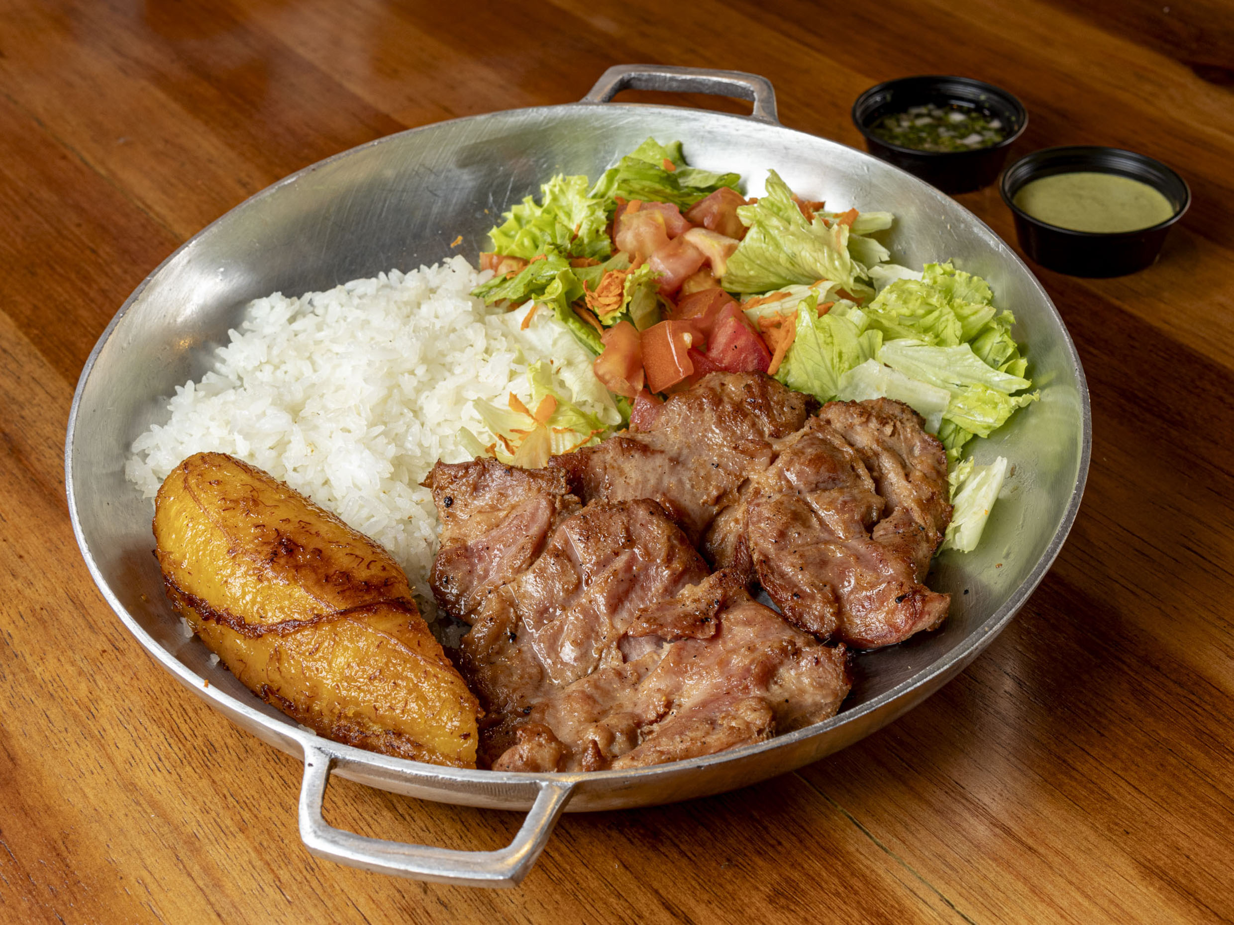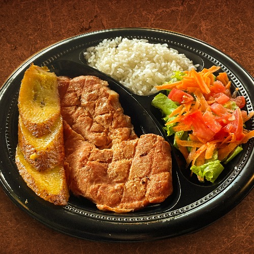 Plato para una (1) persona, elige una (1) proteína entre las siguientes: chicharrón totiao o costilloneta o panchetta o cerdo bbq estilo texas, acompañada de arroz + ensalada (lechuga + tomate) + 1/2 maduro.