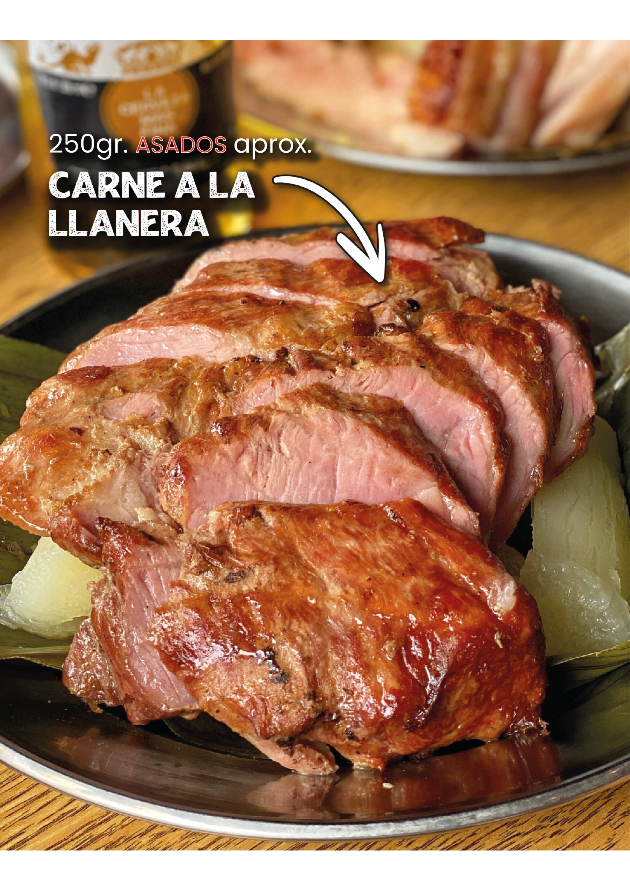 Combo carne llanera para dos (2) personas + papa cocida + yuca cocida + un (1) maduro + dos (2) cervezas club dorada en lata.