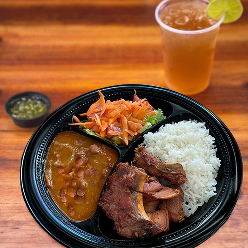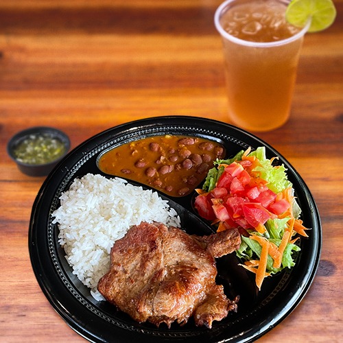 Plato para una (1) persona, elige una (1) proteína entre las siguientes: chicharrón totiao o costilloneta o panchetta o cerdo bbq estilo texas, acompañada de arroz + ensalada (lechuga + tomate) + 1/2 maduro.