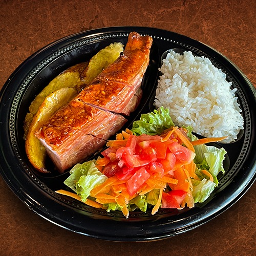 Plato para una (1) persona, elige una (1) proteína entre las siguientes: chicharrón totiao o costilloneta o panchetta o cerdo bbq estilo texas, acompañada de arroz + ensalada (lechuga + tomate) + 1/2 maduro.