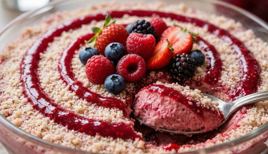 Postre de frutos rojos acompañado de mermelada artesanal de frutos rojos y leche entera.