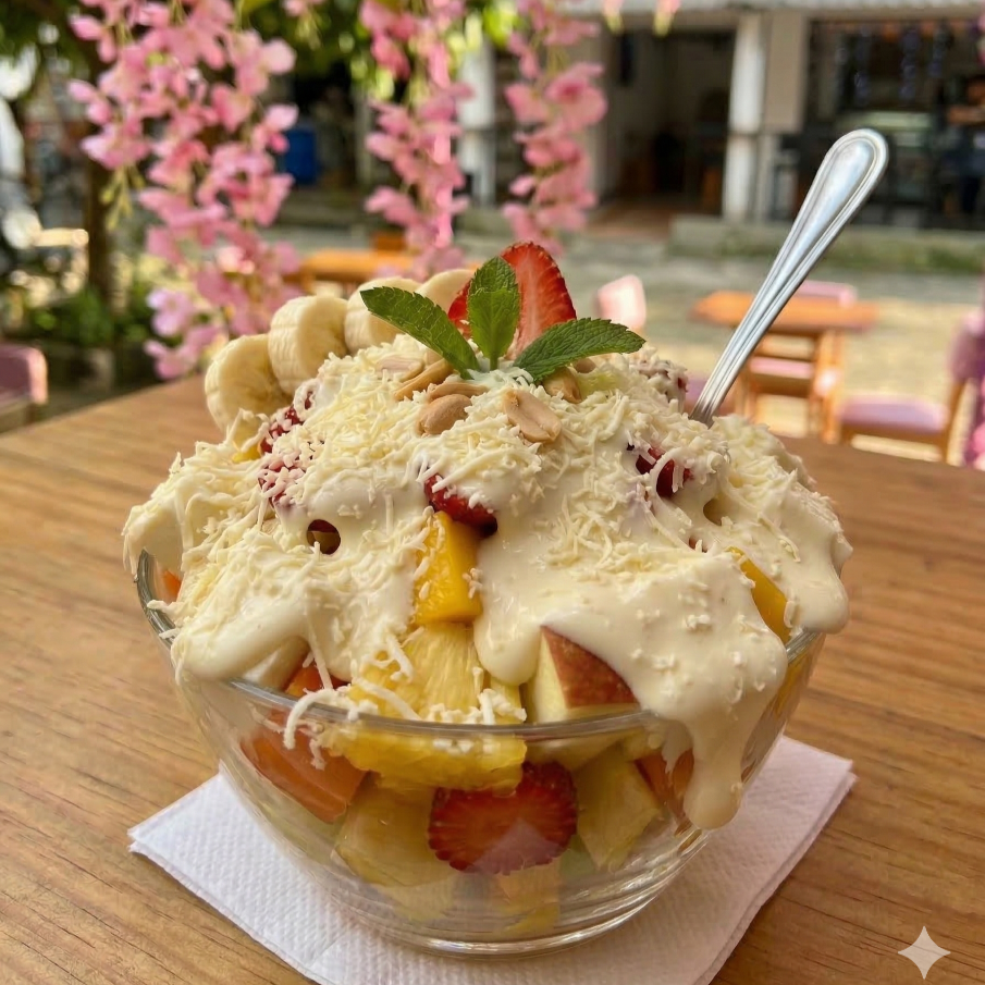 Ensalada de frutas acompañada de crema especial de la casa, banano, fresas, piña, mango, papaya y queso cuajada.