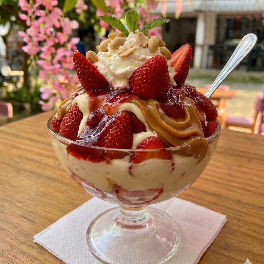 Fresas con crema acompañadas de crema especial de la casa, glaseado de fresa y salsa a elección.