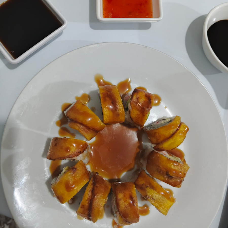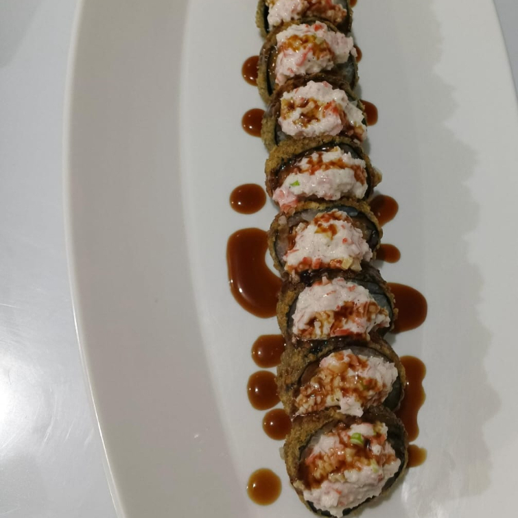 ROLLO MAKI EN TEMPURA, RELLENO DE QUESO CREMA, PIÑA Y SALMON FRESCO, TOPPING MAYONESA JAPONESA, PALMITO, WAKAME, RALLADO CON TERIYAKI Y CEBOLLIN (10 BOCADOS)