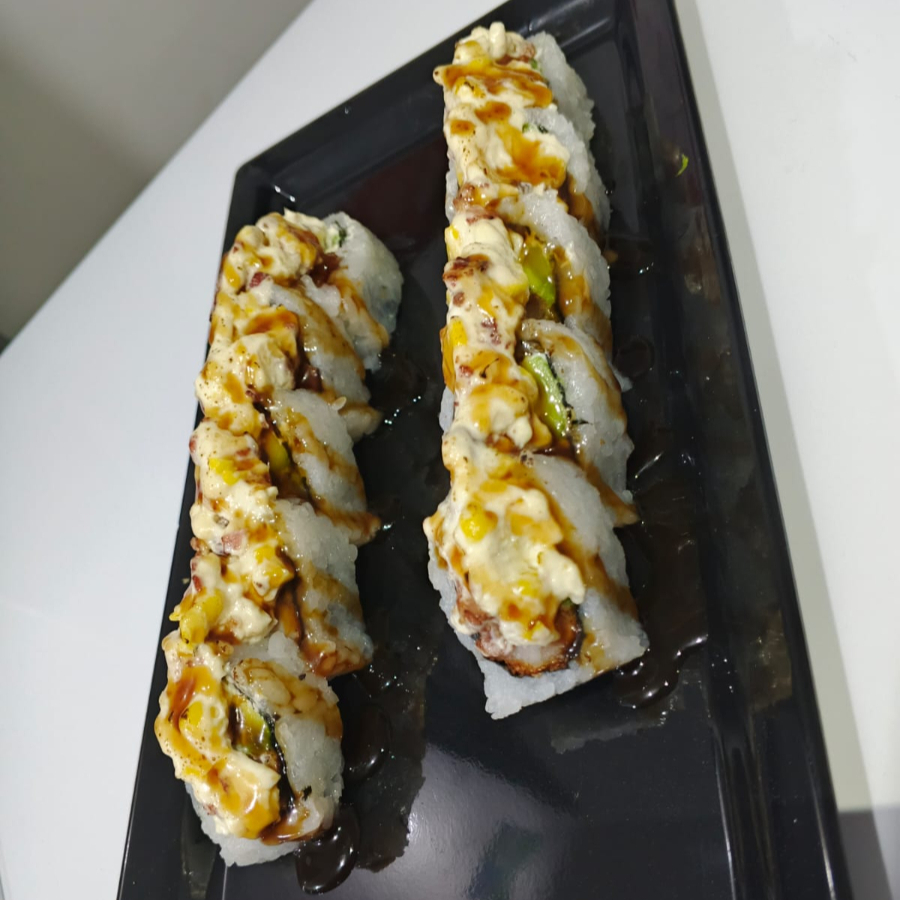 RELLENO DE QUESO CREMA, AGUACATE, Y LANGOSTINO EN TEMPURA CON TOPPING DE QUESO CREMA, MAIZ DULCE, TOCINETA, QUESO PARMESANO, RAYADO CON SALSA TERIYAKI Y CEBOLLIN (10 BOCADOS)