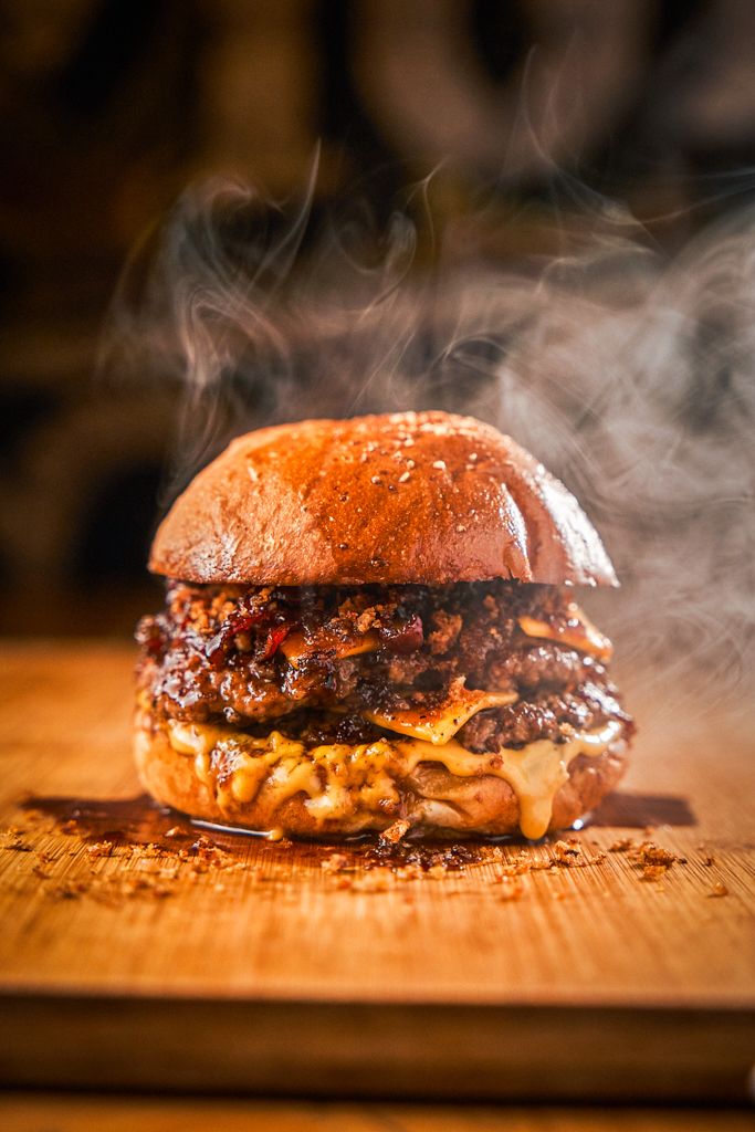 Pan de papa criolla , 150 Gr de carne fresca nacional dividida en dos jugosos patties super smashed, doble queso americano y mermelada de tocineta ahumada en leña en reducción de café y miel, chicharrón totiao en polvo