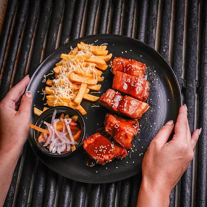 Costillas corte saint louis 300 gr, sweet bbq de la casa, acompañadas de papas a la francesa y queso mozzarella rallado.