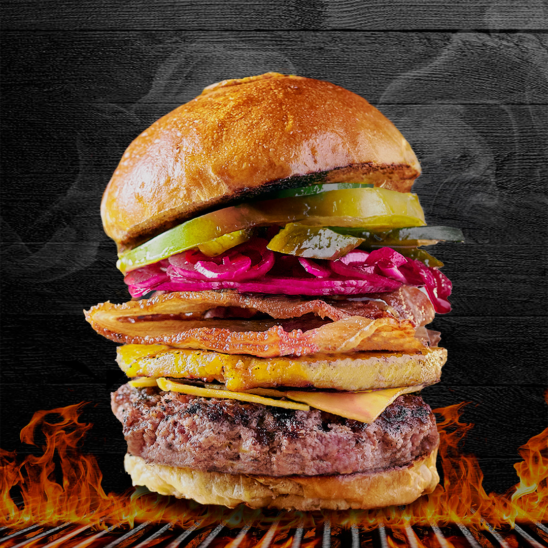 Pan de papa criolla, salsa especial, Carne Nacional a las brasas 150 Gr, queso americano, panceta ahumada en leña y pepinillos