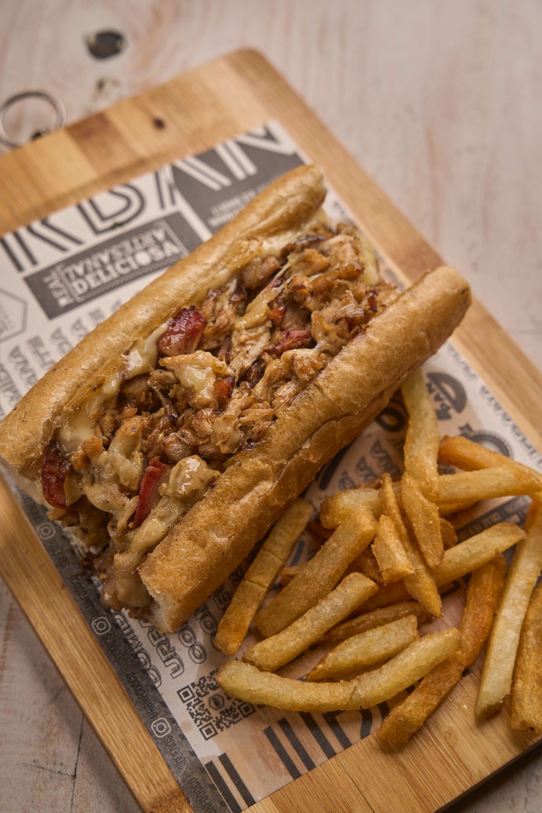 Pan artesanal, salchicha tipo alemán, rellena de queso, doble tocineta, queso americano, cebolla caramelizada, pepinillos y ripio de papa artesanal.