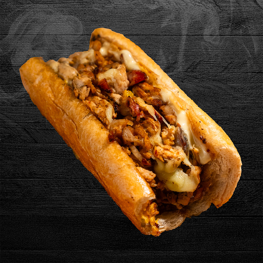 Pan francés artesanal pollo a la parrilla queso Mozarella Tocineta, salsa de la casa.