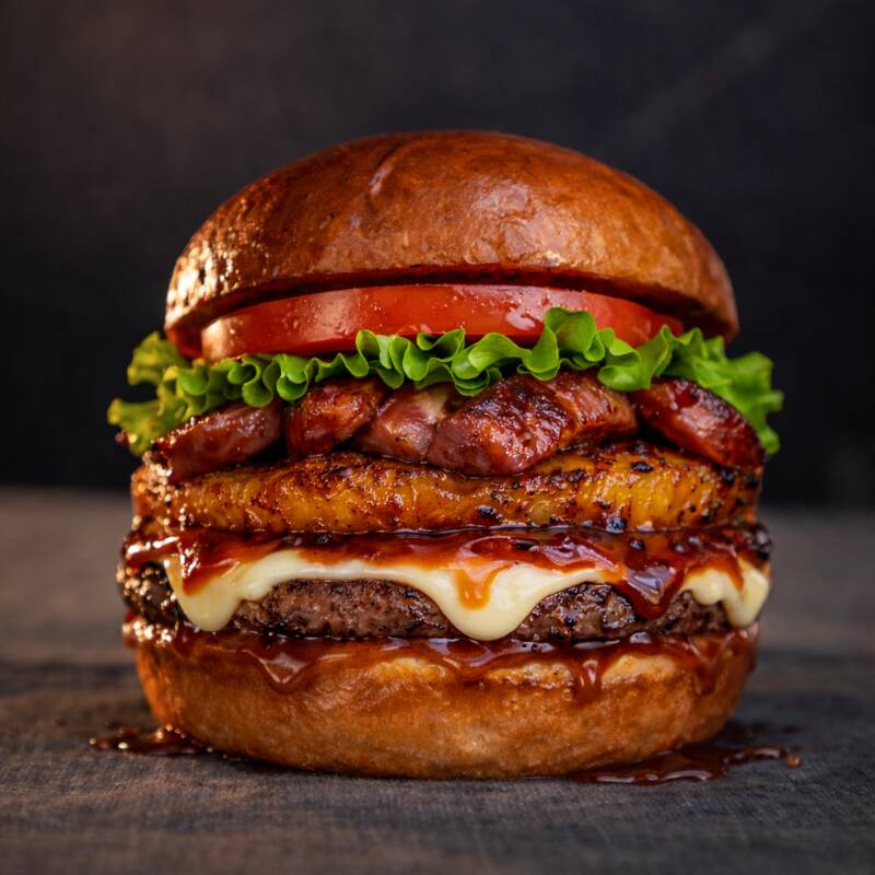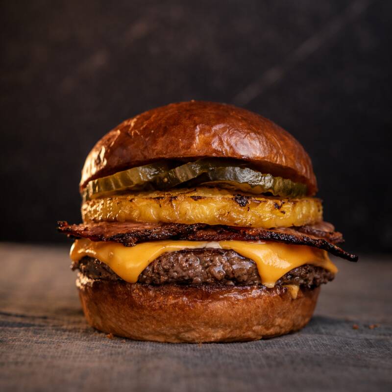 Pan artesanal, carne 100% seleccionada, queso americano, piña a la parrilla, doble tocineta, pepinillos