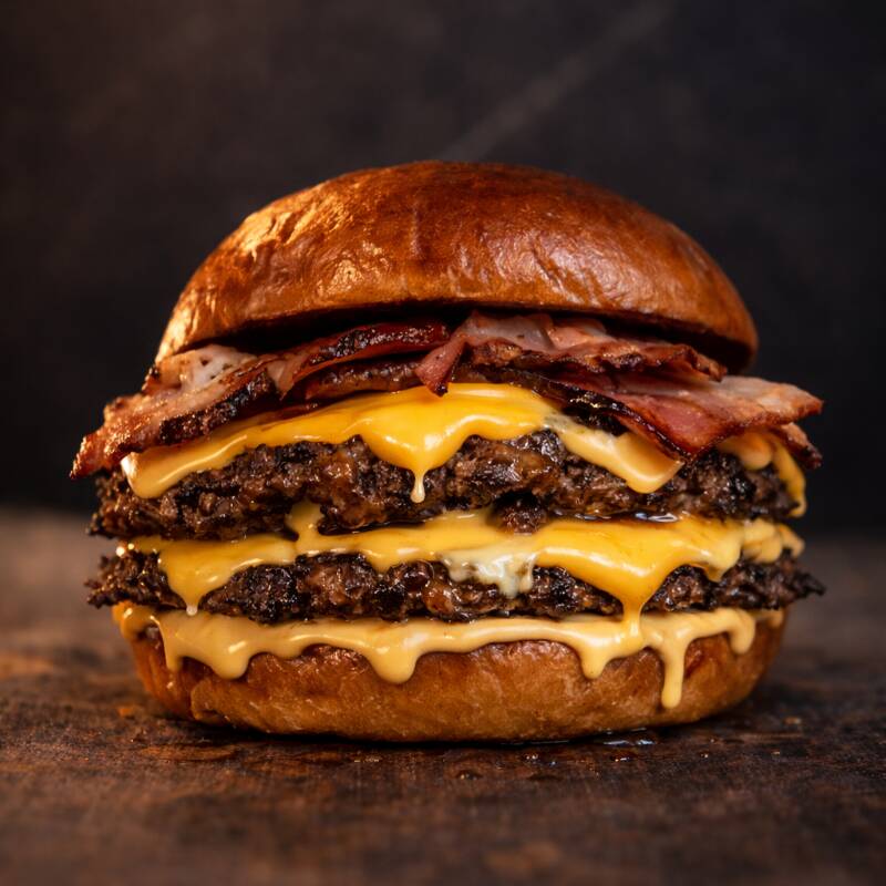 Hamburguesa con pan artesanal, carne 150 Gr sobre cebolla a la plancha y doble queso americano, doble tocineta bañada en miel de maple.