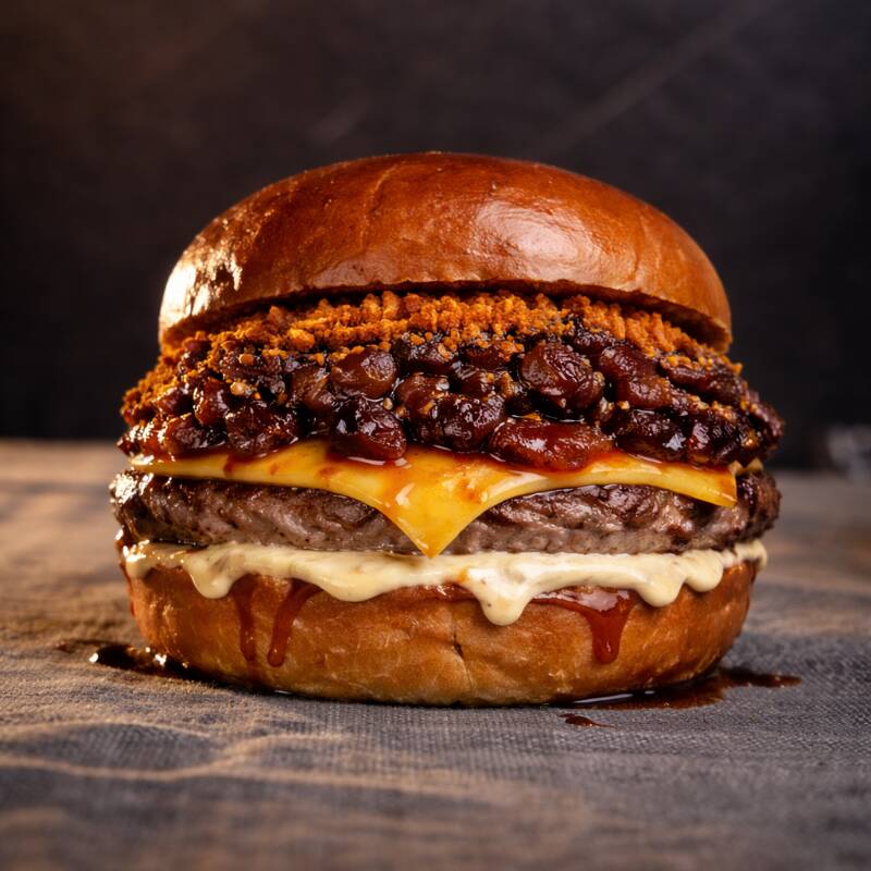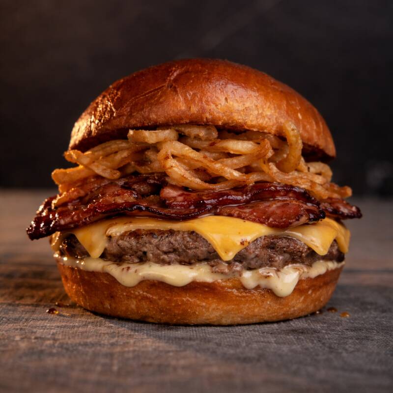 Pan artesanal, carne 100 % seleccionada, doble queso americano, salsa gomela, tocineta bañada en miel de maple y cebolla crispi.