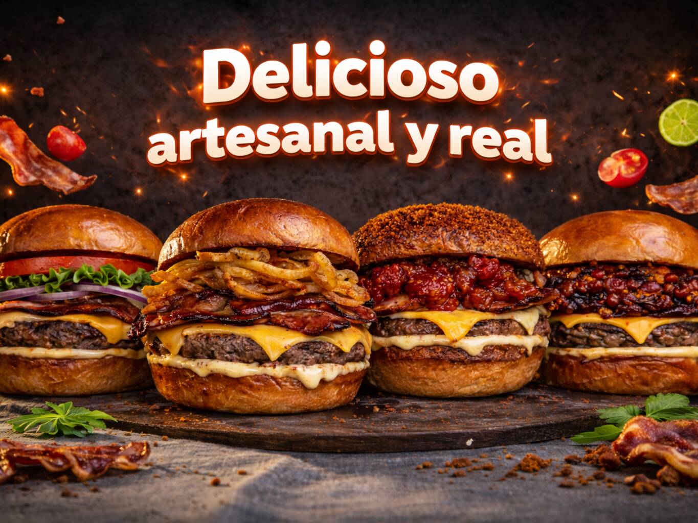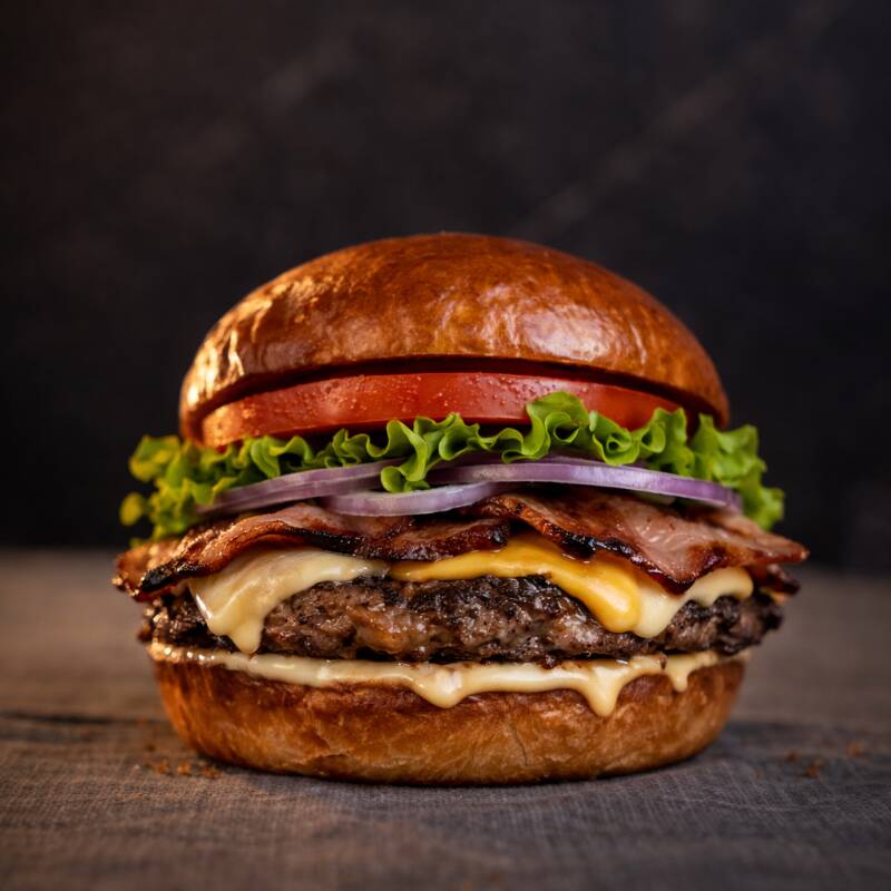 Pan artesanal, carne 100% seleccionada, queso mozzarella, doble tocineta , cebolla fresca, tomate y lechuga .