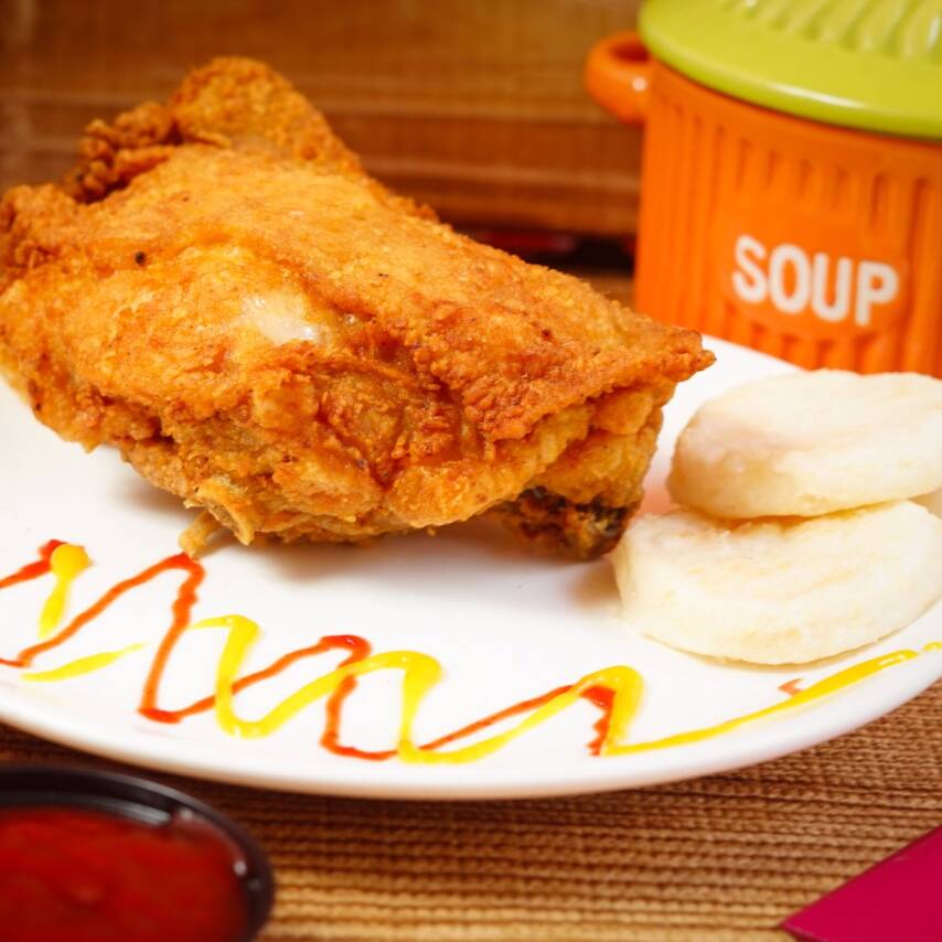 Pan brioche, pollo apanizado, ensalada coleslaw, tocineta, pepinillos y queso cheddar.
