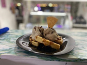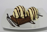 Pastel brownie, chips colores, galleta, salsa chocolate, 2 bolas helado.