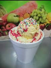 Fresa, manzana, banano, piña calada, queso rallado, crema artesanal y 2 bolas helado.
