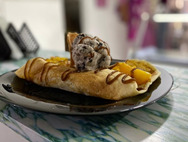Crepe, trozos fresas, trozos banano, queso rallado, 1 bola helado, arequipe y lechera.