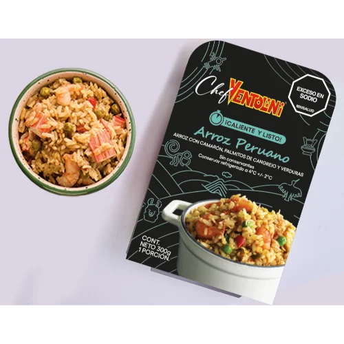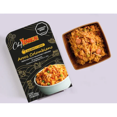 Delicioso arroz con pollo, procesado con tecnología hpp, listo para consumir. Solo 2 minutos en microondas.