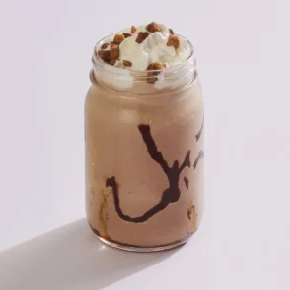 Malteada con helados de caramelo con sal y chocolate, salsas de chocolate y caramelo y soyas caramelizadas.