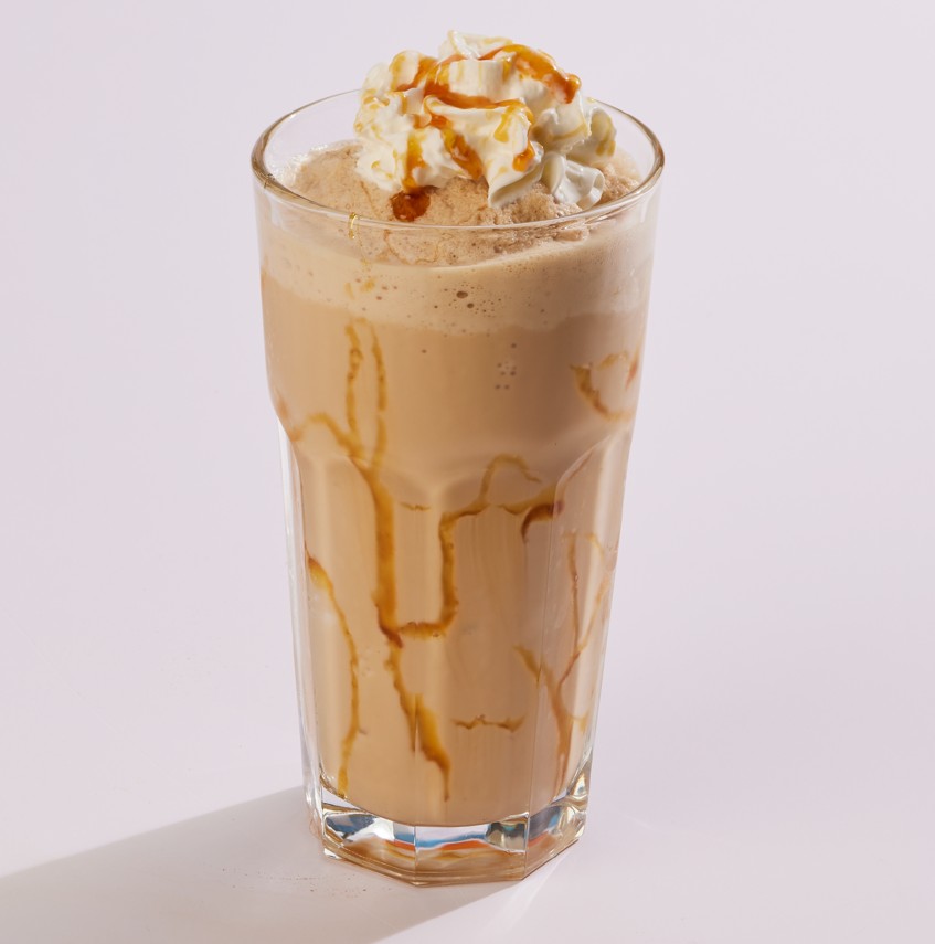 Malteada con helados de caramelo con sal y chocolate, salsas de chocolate y caramelo y soyas caramelizadas.