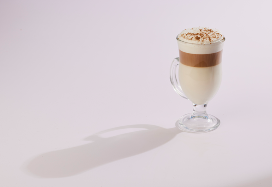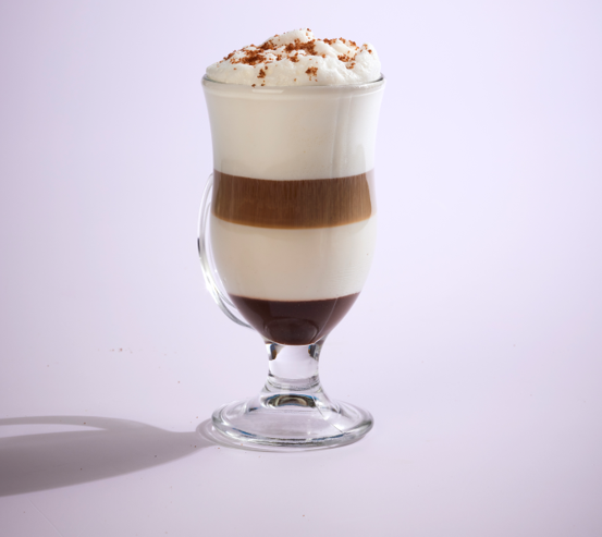 Malteada con helados de vainilla y café, baileys, salsa de chocolate, chips de chocolate y cereza.