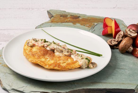 Champiñones, tomate, cebollín, queso holandés y salsa parmesana.