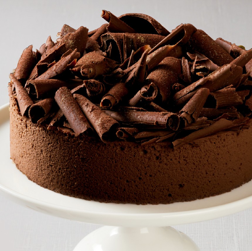 Mousse de chocolate al 70% sobre una capa de torta de chocolate semiamarga con virutas de chocolate. 6 porciones aprox.