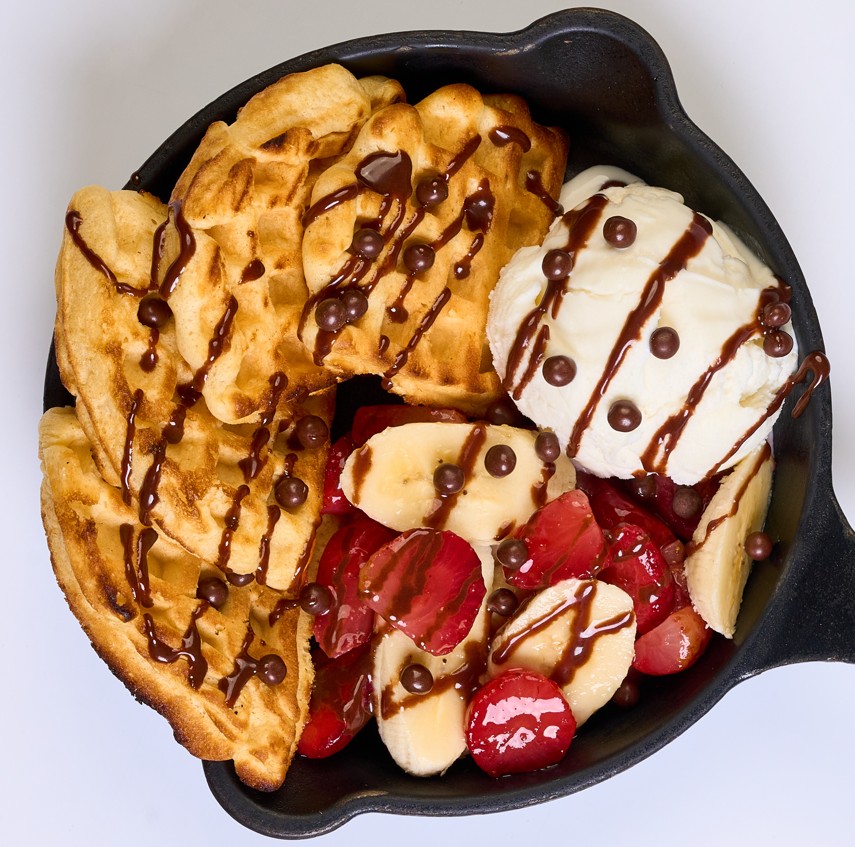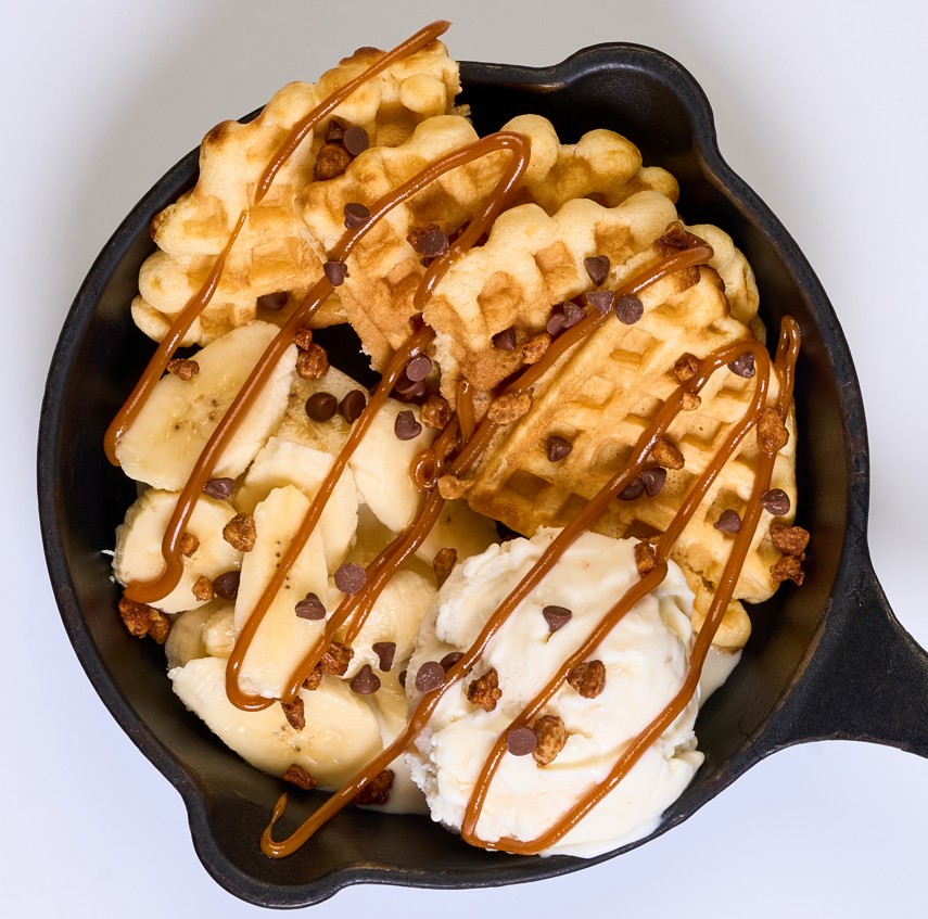 Waffle caliente con tajadas de banano, almendras caramelizadas y chips de chocolate acompañado con helado de macadamia y salsa de arequipe caliente.
