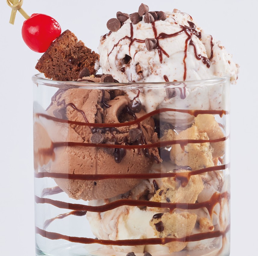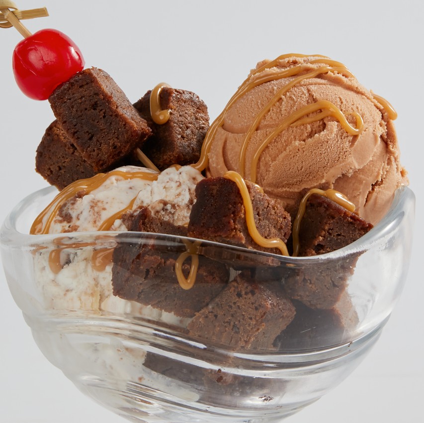 Helados y salsa a elección con trozos de brownie y cereza.