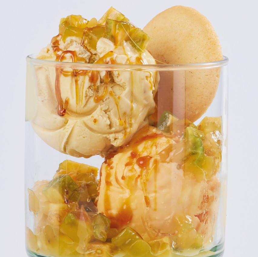 Helados, salsa y galleta a elección, con trozos de galleta, soyas caramelizadas y cereza.