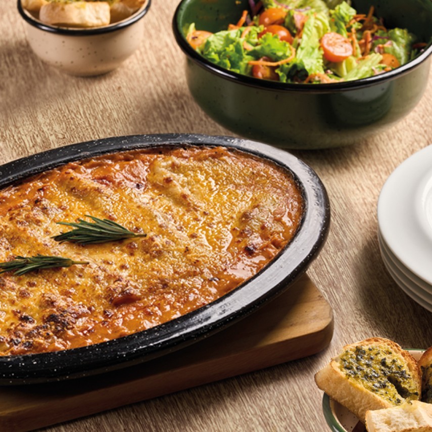 ¡Come en grupo y paga menos! Recomendado para 4 personas. Este menú contiene Lasagna + Ensalada + Pan.