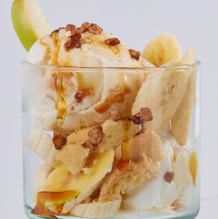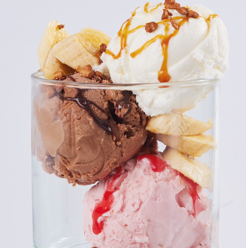 Helados y salsas a elección con tajadas de banano y soyas caramelizadas.