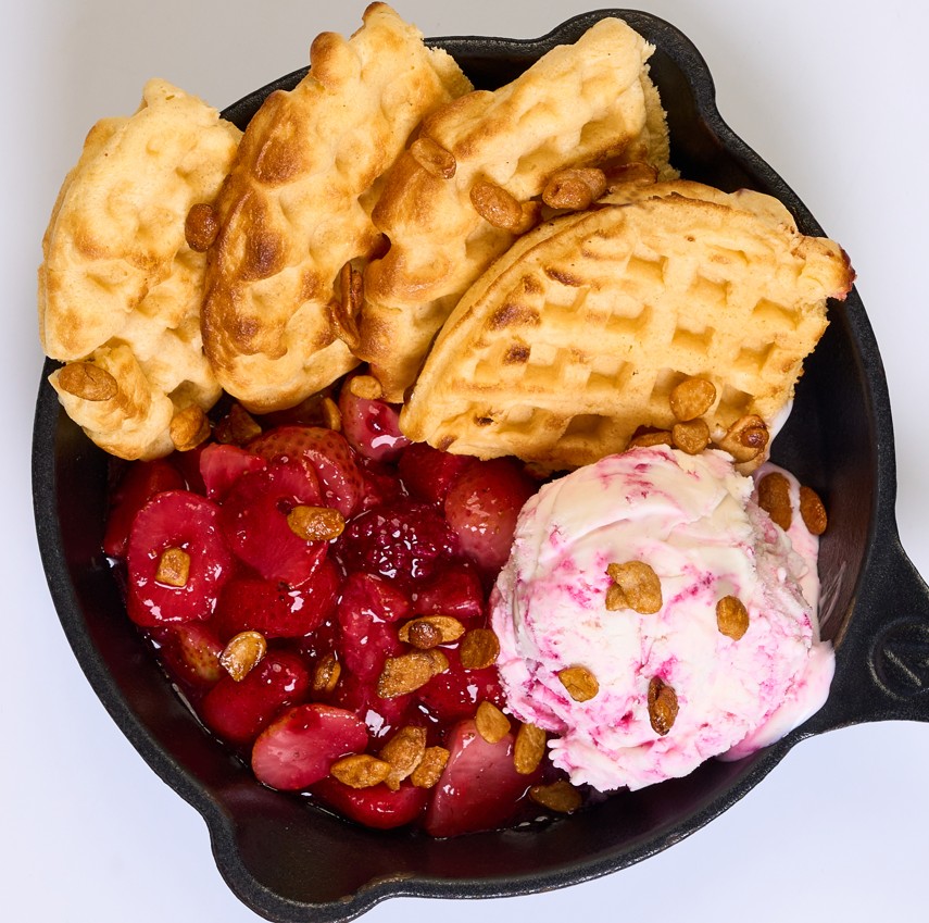Waffle caliente con trozos de fresas en salsa de frutos rojos, con helado de yogurt veteado de mora