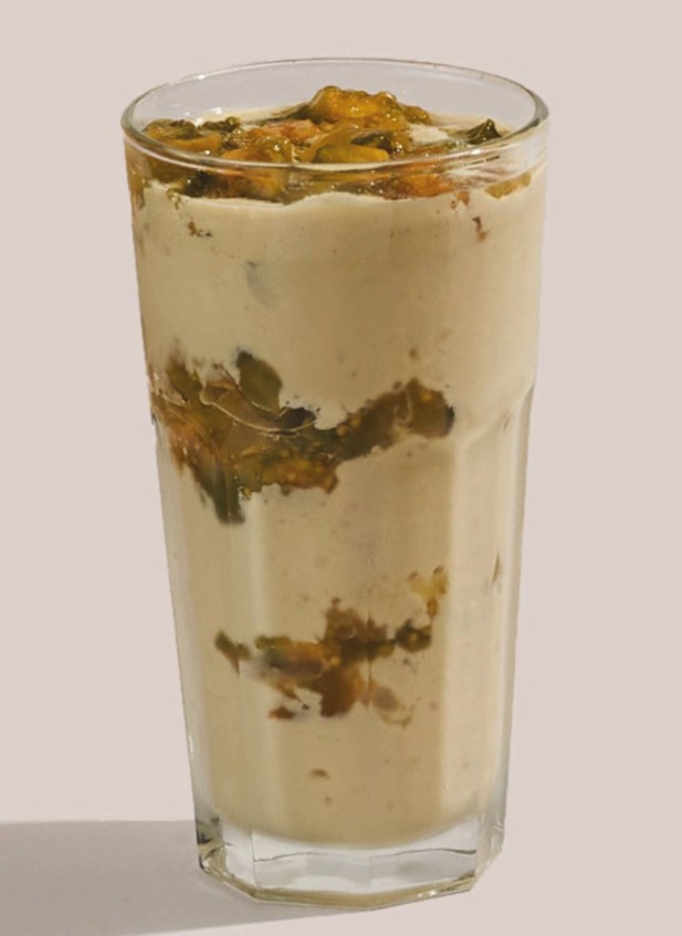Malteada con helado de maracululo y trozos de lulo.