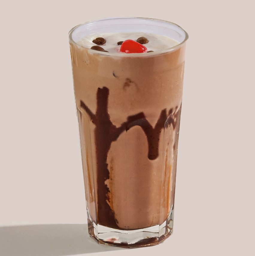 Malteada con helados de vainilla y café, baileys, salsa de chocolate, chips de chocolate y cereza.