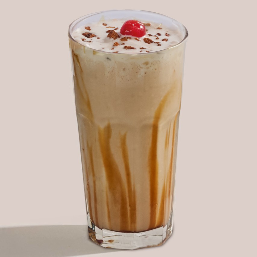 Malteada con helados de caramelo con sal y chocolate, salsas de chocolate y caramelo y soyas caramelizadas.