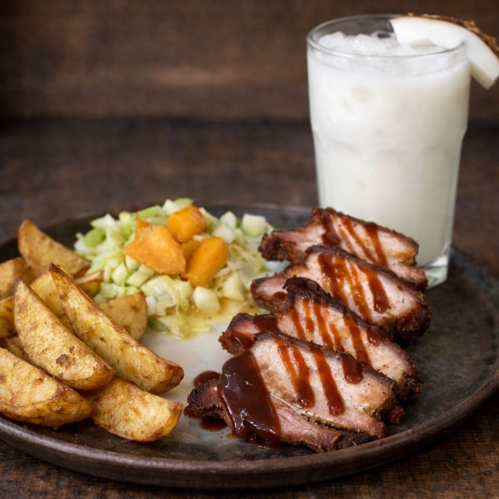 Deliciosos 250 gramos de filete de cerdo ahumado al barril, acompañado de deliciosas papas de la casa, acompaada de ensalada tropical, salsas de la casa y limonada de coco natural.